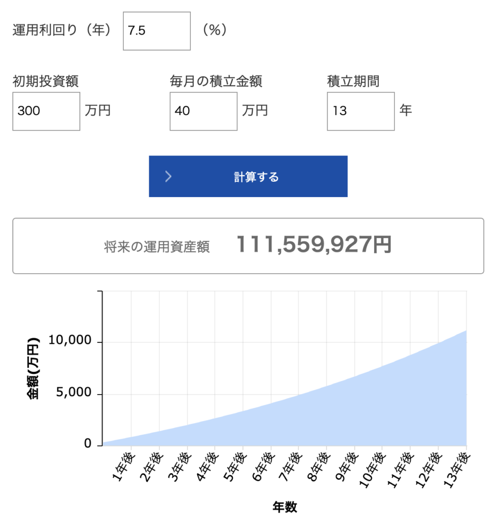 「オルカン」の過去30年平均利回りが7.5%であるため、毎月40万円を積立投資することで約13年後を目標にまず1億円の純資産を築き上げることを目標としております。
